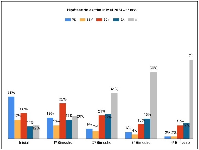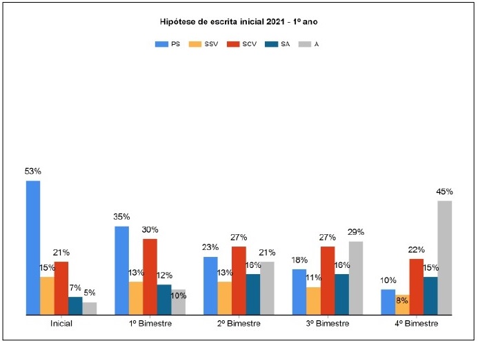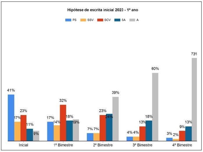 Já em relação aos alunos do 1º ano, o salto na aquisição da base alfabética foi excepcional, pois anteriormente, nas escolas da Rede Municipal, o foco da alfabetização era a partir do 2º ano.