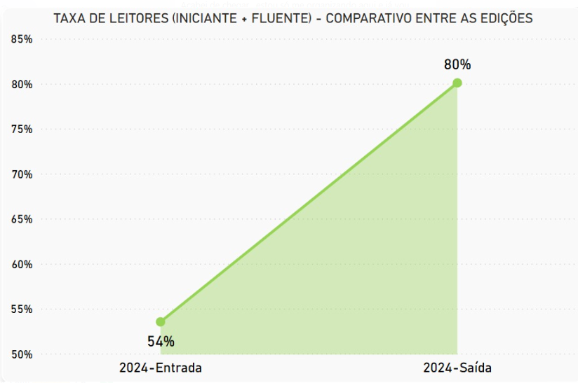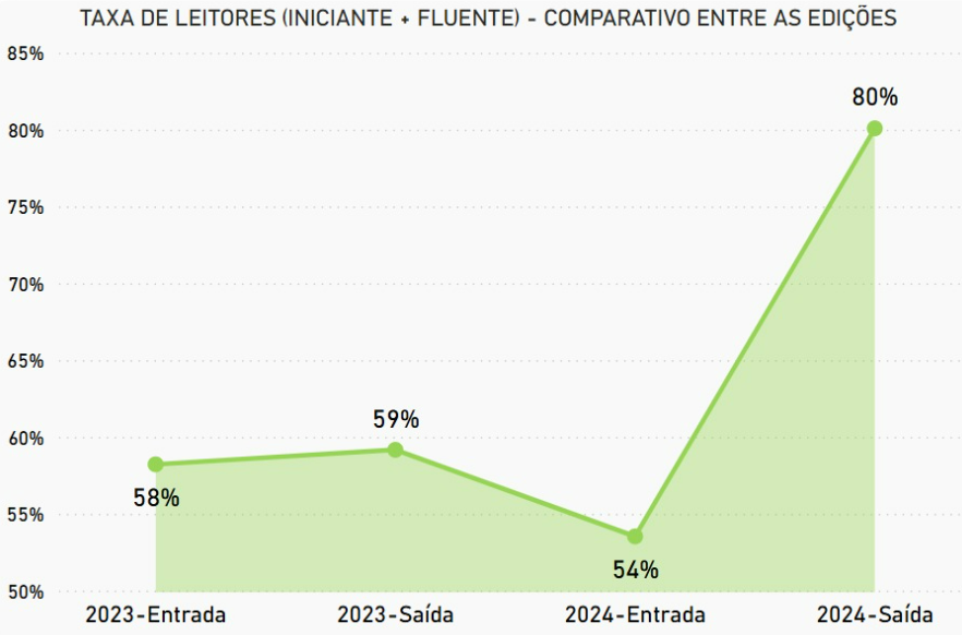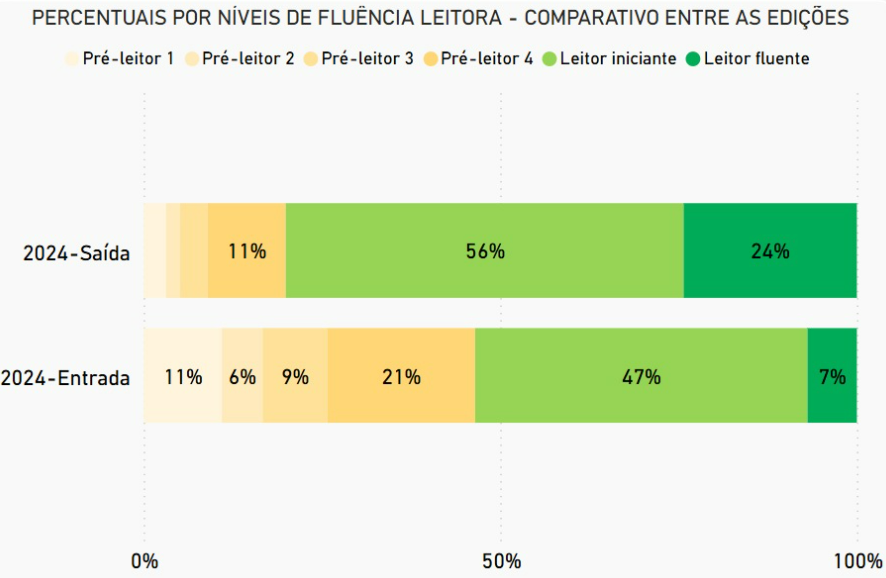 ● Avaliação de Saída: aplicada entre 18 de novembro e 6 de dezembro, com a participação das mesmas 29 escolas e adesão de 98,7% dos estudantes, o que equivale a 2.280 alunos.