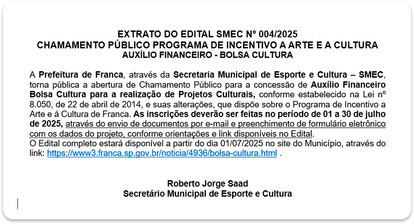 A Prefeitura de Franca, por meio da Secretaria Municipal de Esporte e Cultura, informa que estão abertas as inscrições para o Programa de Incentivo à Arte e à Cultura – Bolsa Cultura 2025.